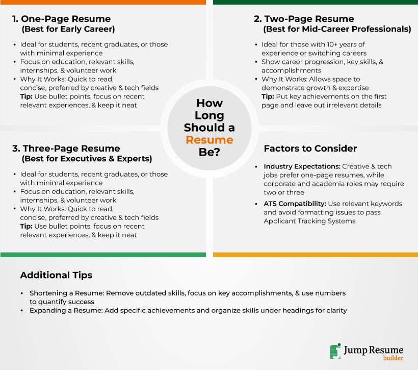 A well-organized resume helps employers find important details quickly. The right length depends on your experience and the type of job you want. Below are some best practices to follow based on resume length.